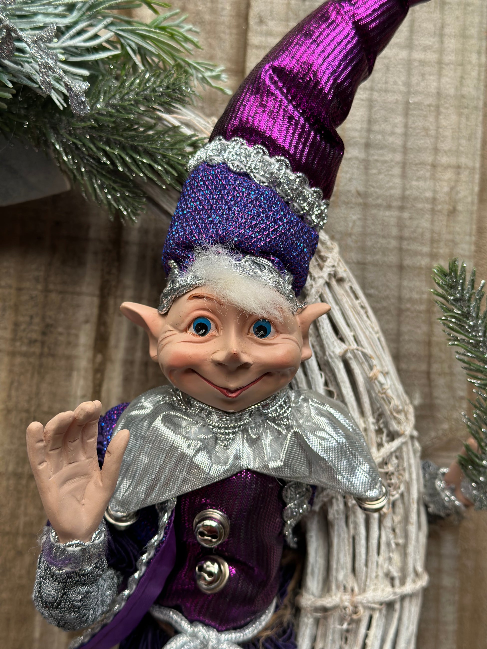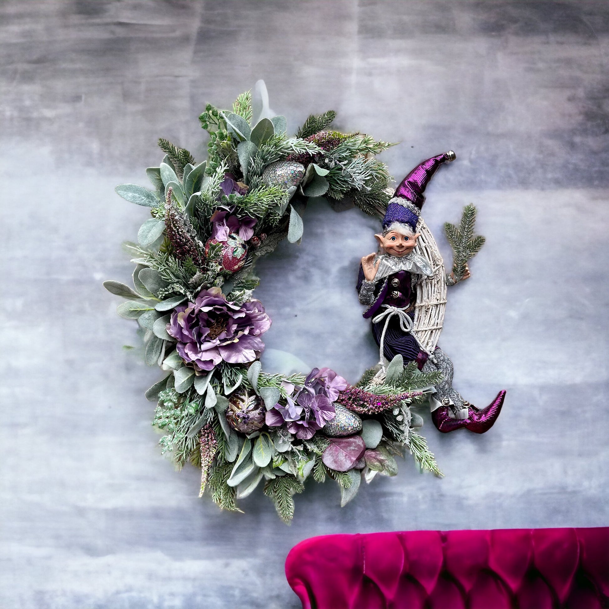 Handcrafted with care, it showcases a captivating blend of lamb's ear, spruce pine, and silver foliage. The focal point is a striking metallic plum-hued anemone, surrounded by delicate hand-made ornaments with lace and bead accents. Adding a cheeky touch, a playful elf wearing his matching outfit, sits on the side, bringing a mischievous charm to the wreath.