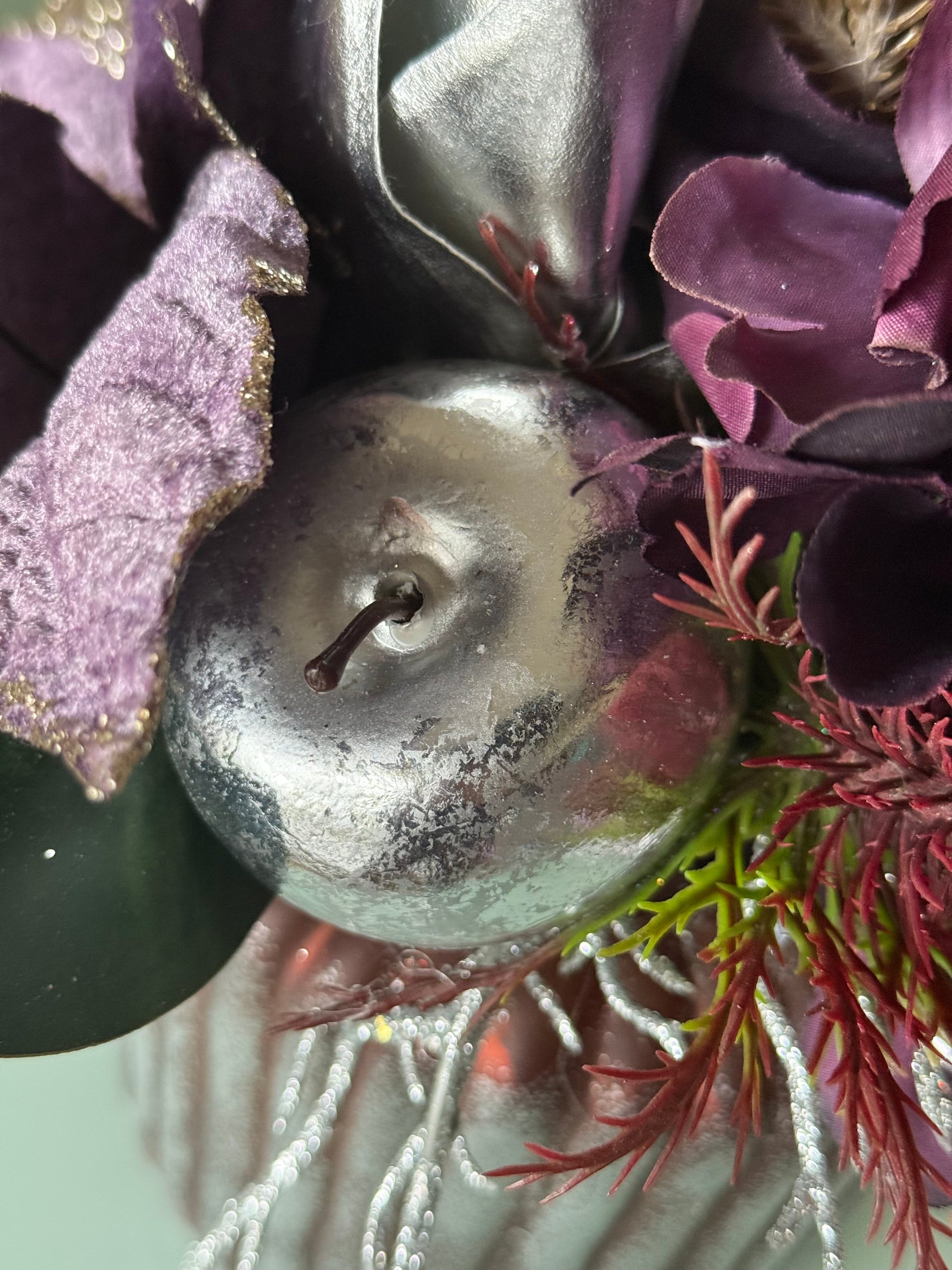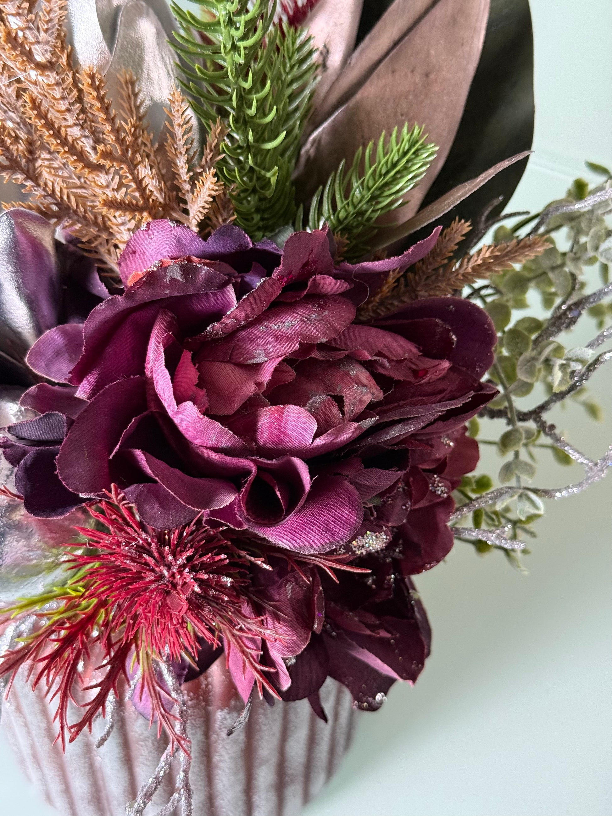 Featuring a stunning plum poinsettia as the centerpiece, silver king protea accented with deep burgundy blooms, silver apple, ferns, and winter greenery, this piece captures the magic of the season. Housed in a textured vase with a frosted finish, it radiates festive charm from every angle.