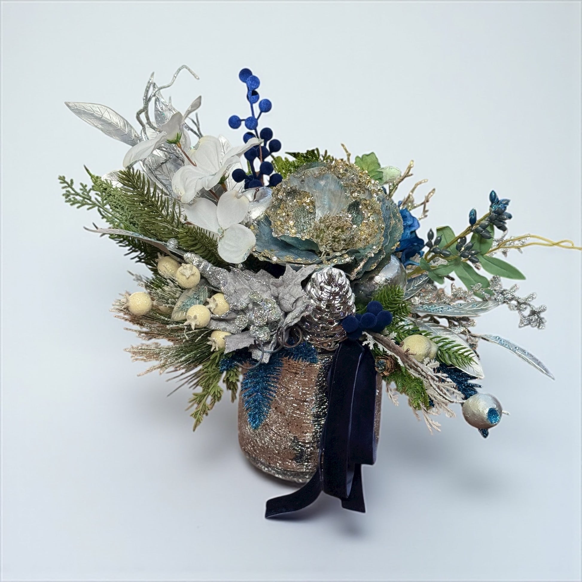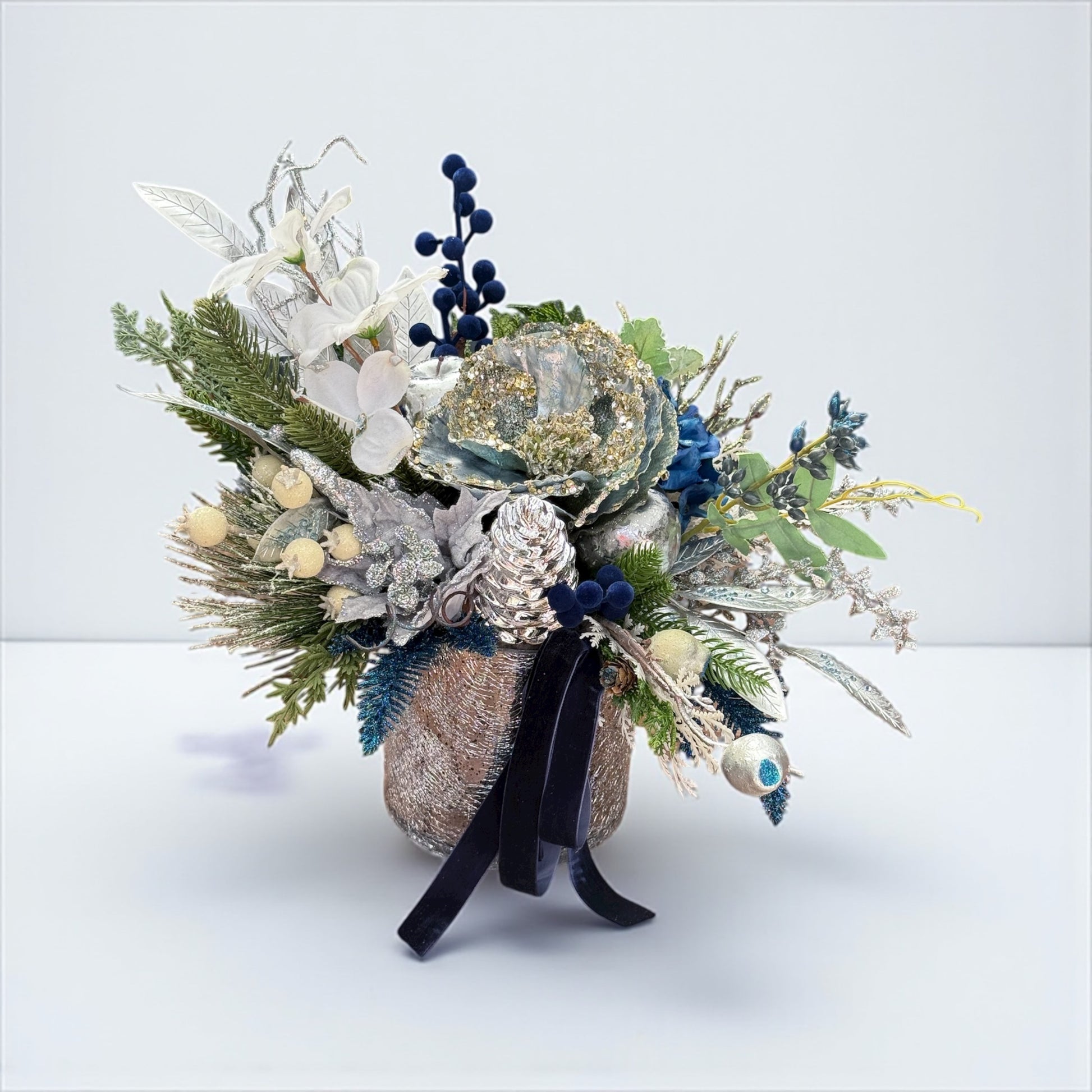 Meet our “Frosted Sapphire Christmas Arrangement” — a luxurious Christmas design designed to add sophisticated sparkle and serene beauty to any space.