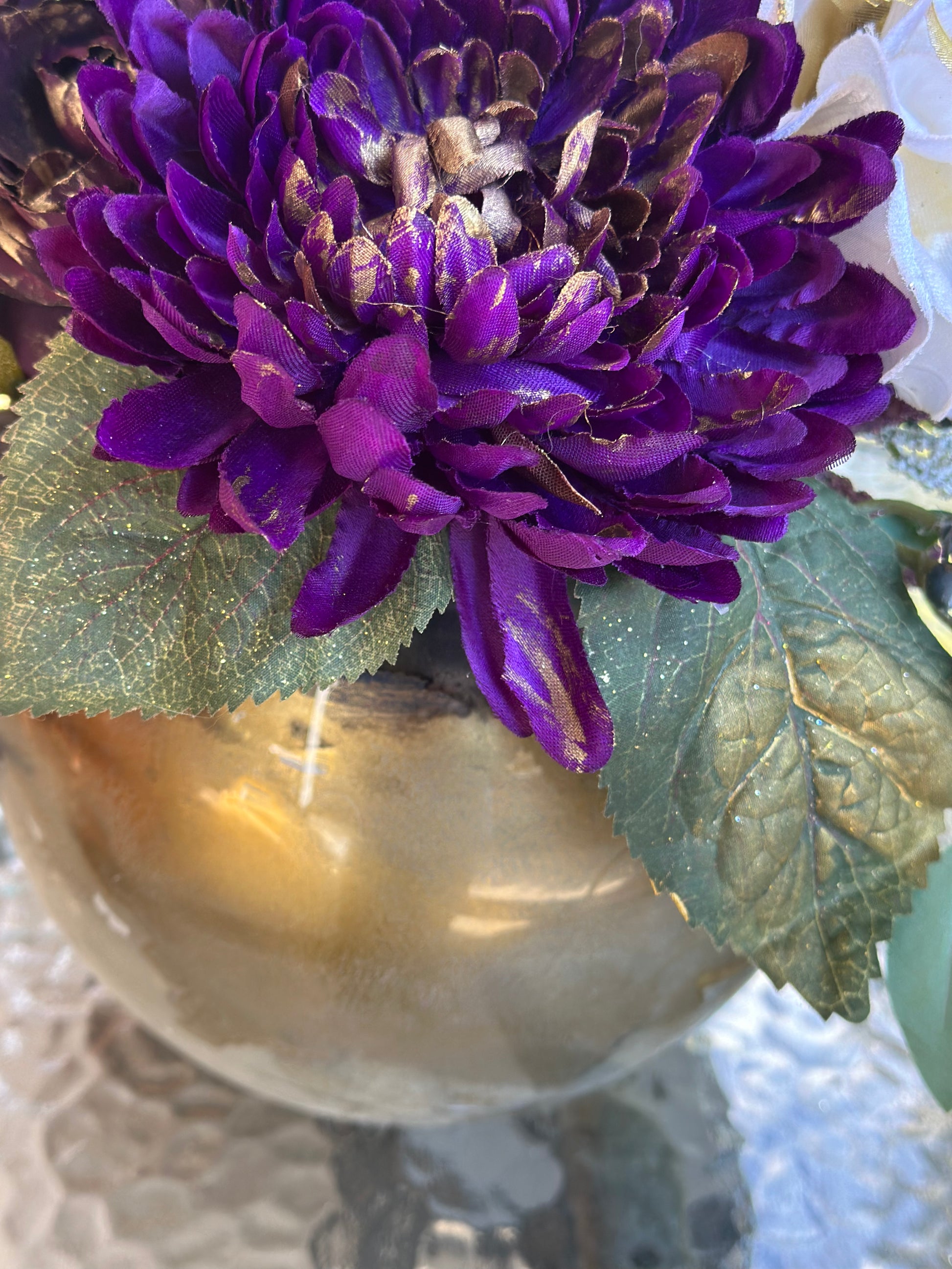 Inspired by the magic of Christmas ballet and classic seasonal charm, this exquisite design features rich plum dahlias, velvet-soft poinsettias, delicate ivory blooms, and frosted pinecones—artfully arranged with champagne-gold foliage and lush winter greenery. Presented in a marble-look gold glass vase, this show-stopping piece brings opulence and whimsy to your festive décor.