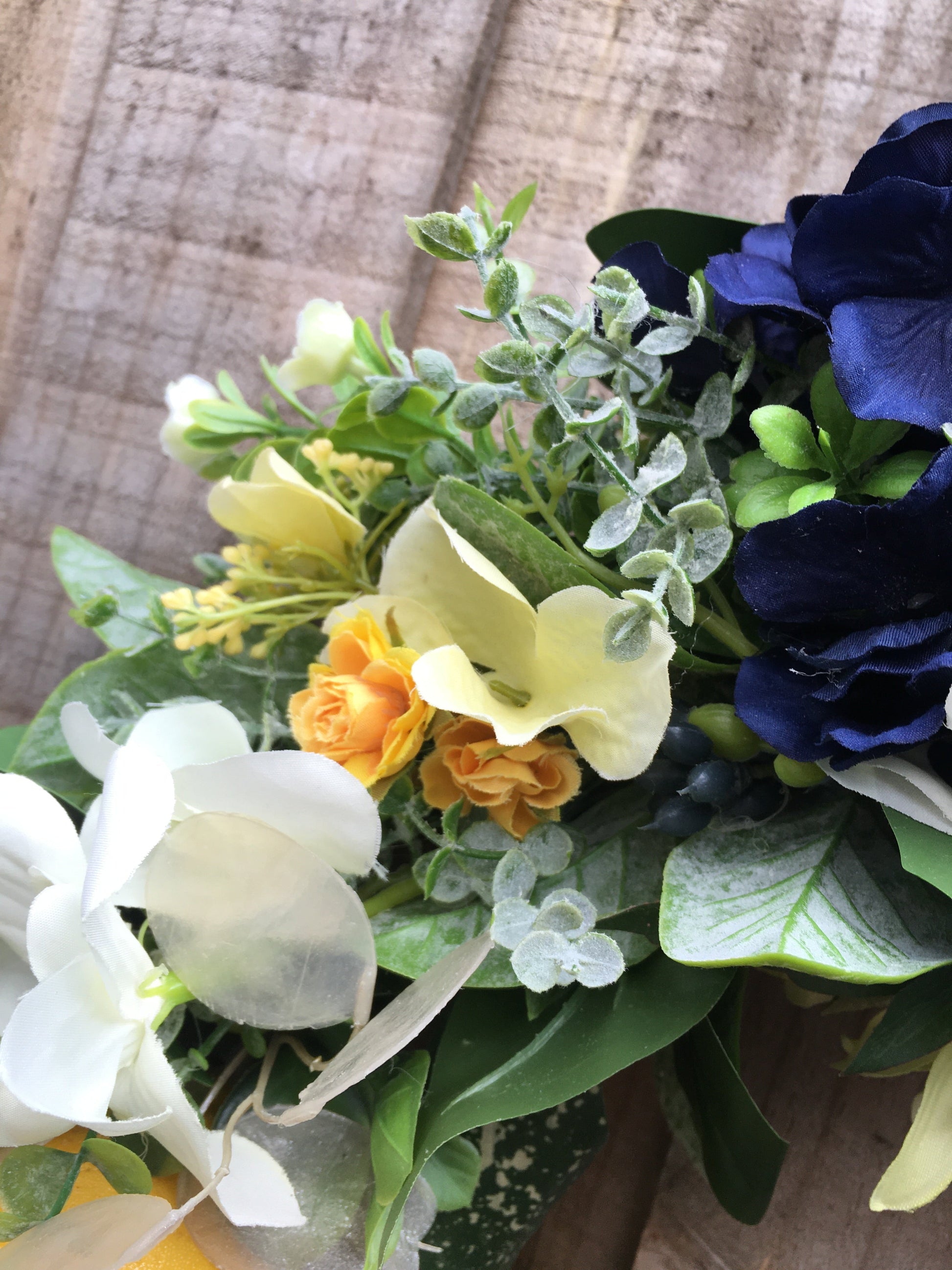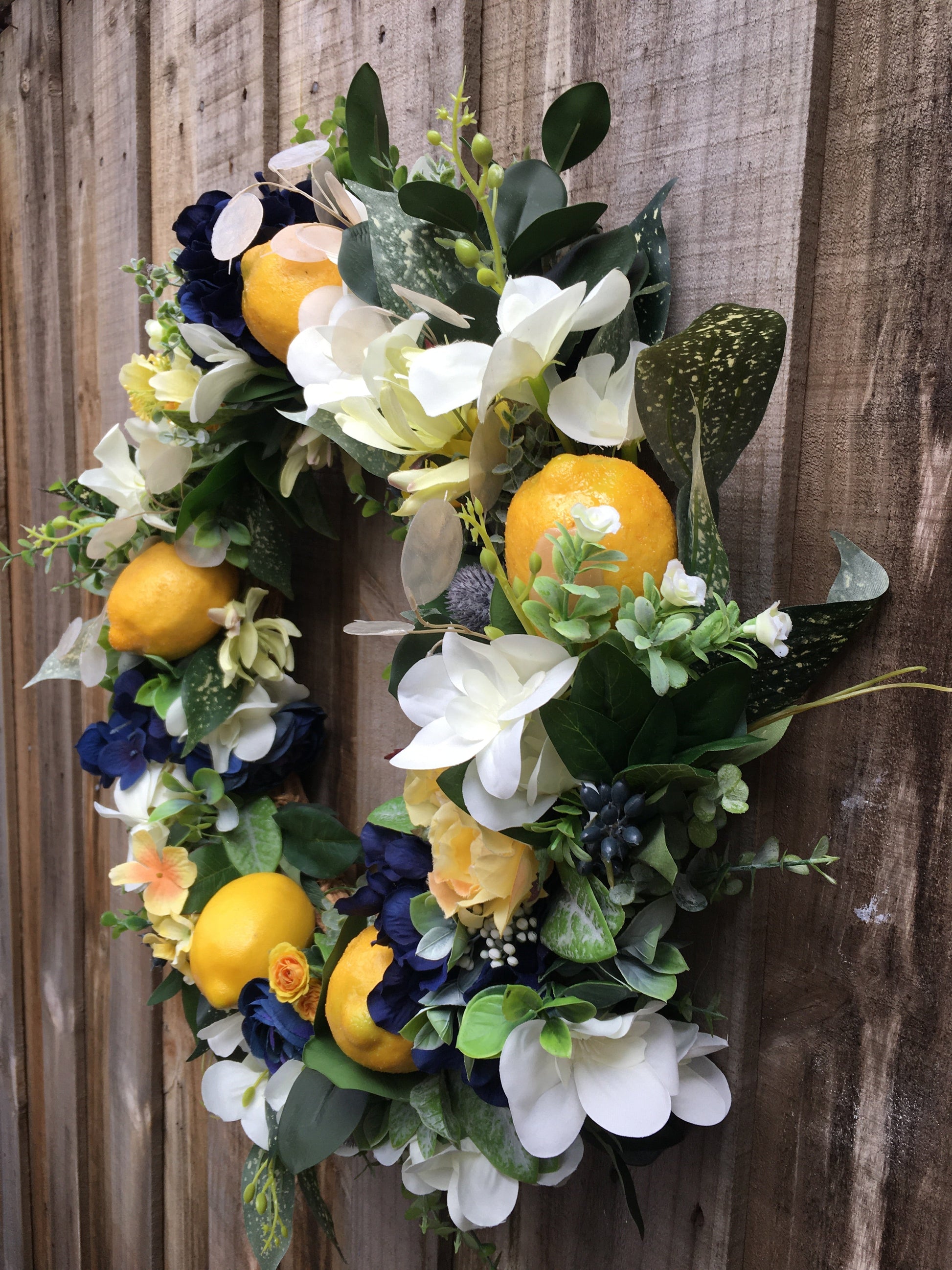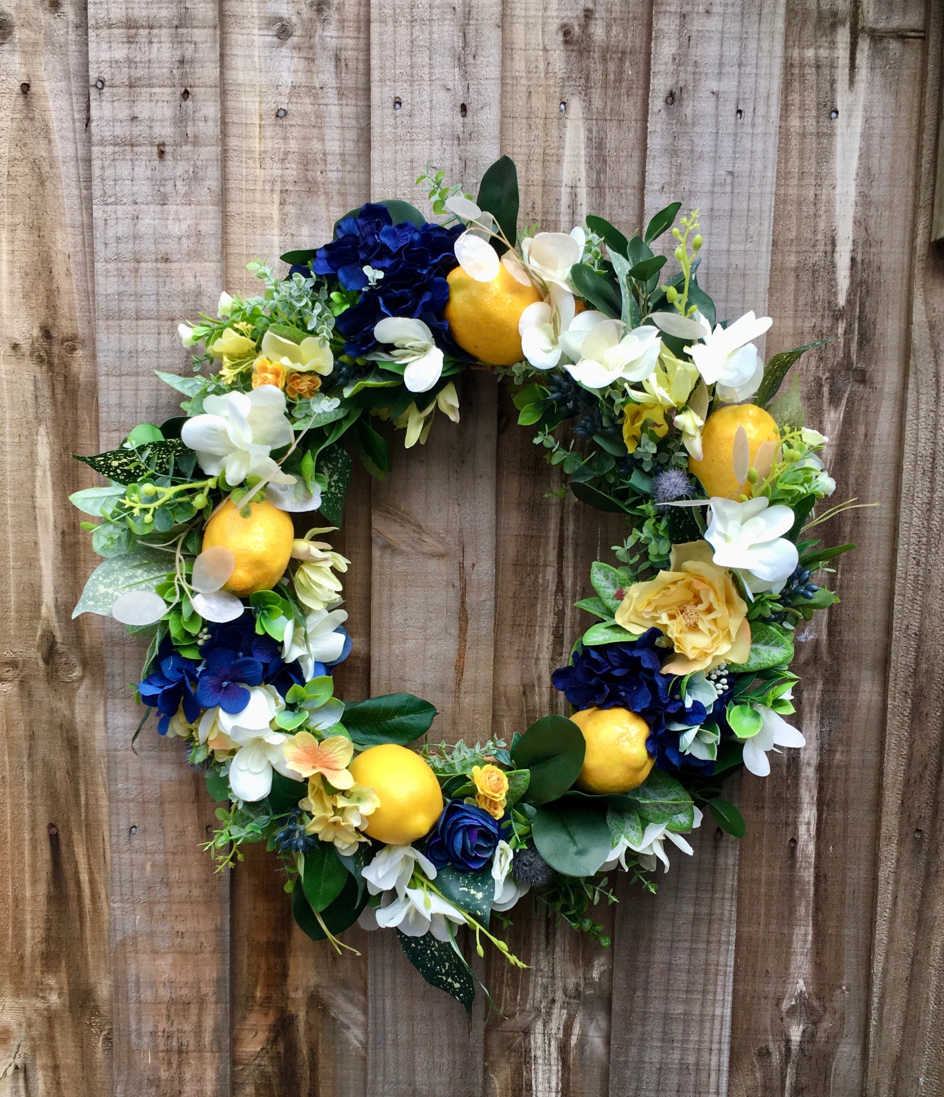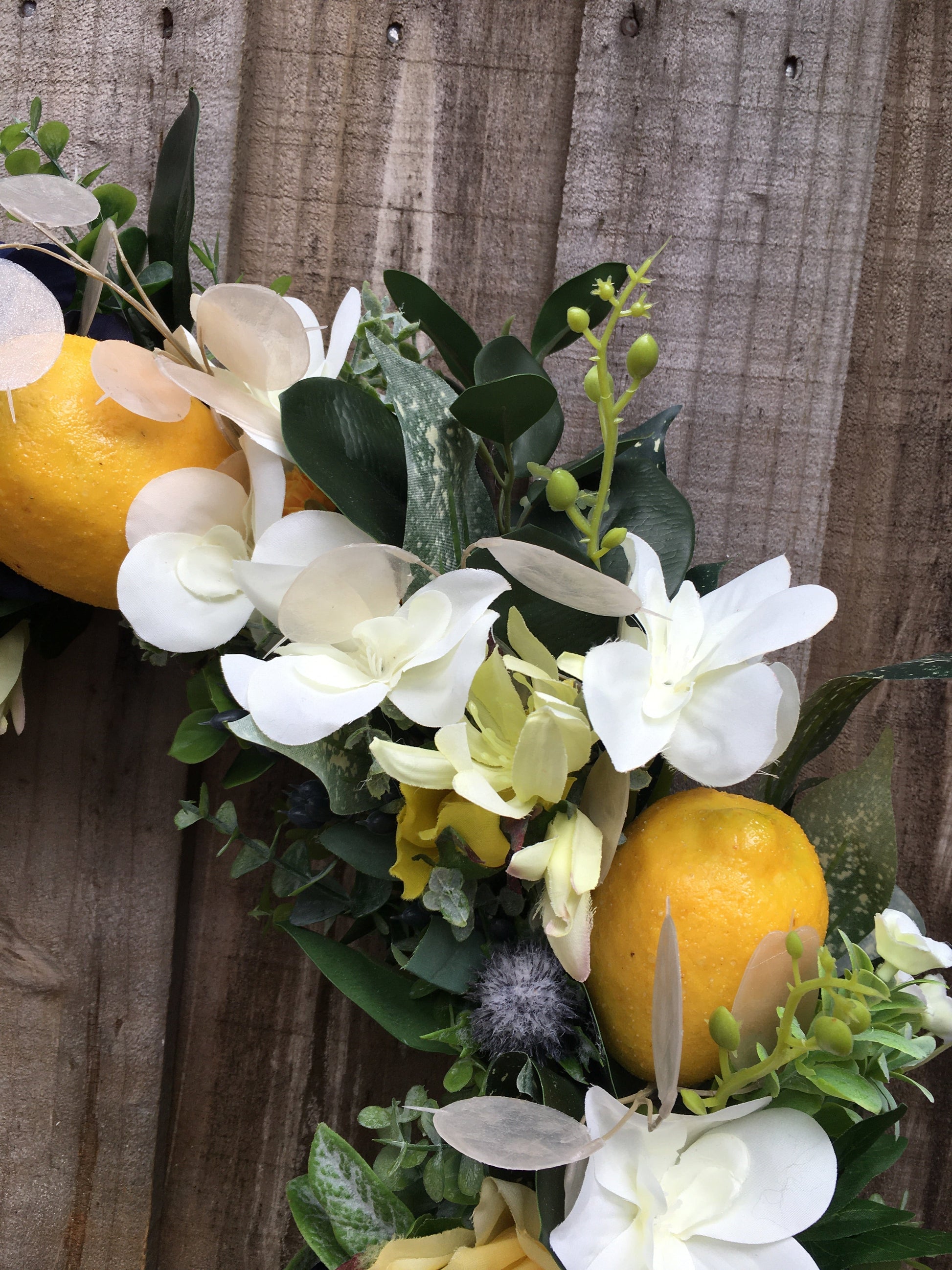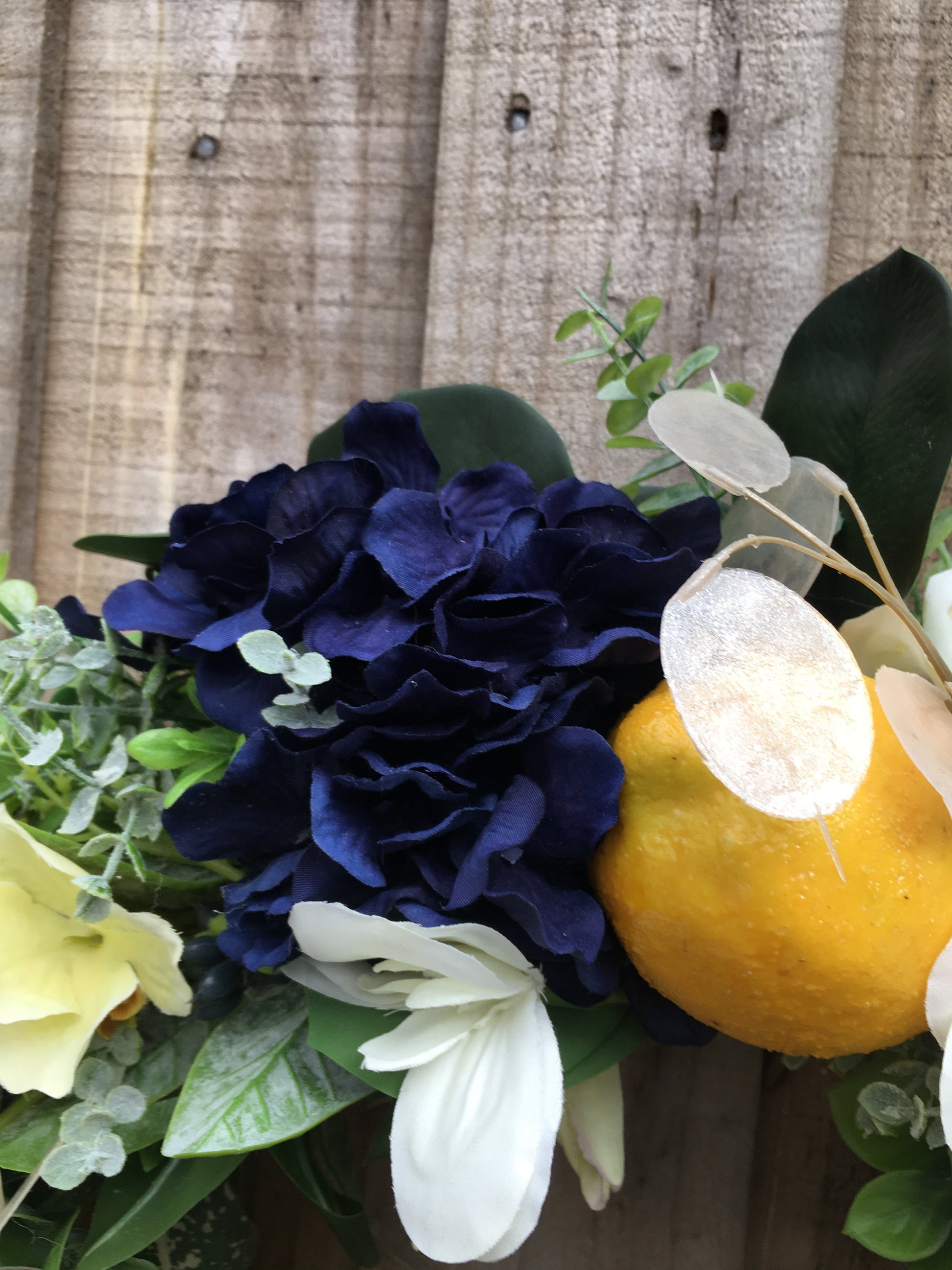Colourful and Stylish, this Wreath is nothing short of showstopping. Our Tuscan Sunset Wreath will provide a beautiful welcome to all who enter your home. It features lush greenery and berries. Indigo blue Hydrangeas, Yellow Roses, Cream Orchids, and Jasmine adorned with Florida beauty Leaf, Honesty bush and Lamb Ear on a rattan, handwoven base. Bright and realistic Lemons add some sunshine to the interior. This elegant Wreath is a perfect gift for all occasions, like Mother's day or a Housewarming party.